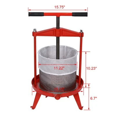 Unique Design & Less Labor and Time – T shaped hand shank,Spirallyand and Phase-in Press,More easierto use, even for ladies.Higher Juice Yield – Thicker press plate & Large area ,Larger Stressed Area,More thorough press, Higher Juice Yield.Large Caliber & Capacity – Higher Efficiency,Can press 12LB to 18 LB of fruit at one time.Built with a heavy duty steel frame, thick stainless steel basket.Multifunction,Pure Natural Juice- Press all kinds fruit,like apple, grape etc. and Press Vinasse ,Oil Pomace and Honeycomb.Widely Usage- Perfect for Family Party,Eatery,Fresh Squeezed Fruit Store,Midget plant and so on.