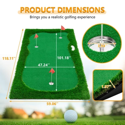 - The golf putting green comes with 3 golf holes and is also equipped with a stainless steel cup and flagpole to improve accuracy and precision when hitting, giving you a realistic golf experience.