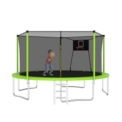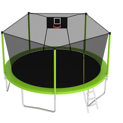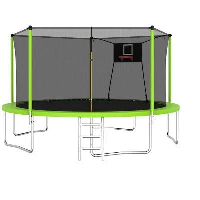 - Safety First-14 FT Trampoline is equipt with 5 high safety enclosure poles and heavy gauge galvanized rust resistance steel construction. 5 W-shaped legs secure stability.