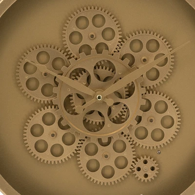 Drawing from multiple motifs to create an alluring statement piece, this decorative wall clock boasts a round silhouette, a clear acrylic face, gold Roman numerals that mark each quarter hour, and a cluster of gears that move silently in the center. Whether it is placed in your living room, hallway, office, or kitchen.