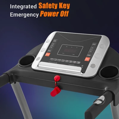 About this itemThis stable and durable treadmill provides everything you need for your daily exercise. Holds 300 pounds. The sturdy structure is equipped with a 2.5HP motor to ensure satisfactory training performance.We have preset 12 built-in running programs for this treadmill, or you can choose the rhythm you want within the range of 0.5-7.5MPH as you like. The running board is 3-level manually adjustable to meet your personal experience. You can shut down this running machine immediately with the safety key on the control panel to avoid accidental injury.The standard LED display provides intuitive feedback of time, distance, speed, calories, and heart rate, so you can monitor your exercise status. Both armrests have integrated hand pulse sensors to provide synchronous monitoring of critical heart rate data.The excellent shock absorption effect of this treadmill comes from a multi-layer synthetic running belt and a reasonably structured running board, which keeps you away from common running sports damage and protects your knees, hips, ankles, and feet. The quiet belt drive system reduces noise interference while providing performance.Two bottle cages on the panel make water replenishment within easy reach and are equipped with a device stand for your smart device and built-in speakers to help relax while running. Easy to store and set up. Assembly size: 51″ x 24.5″ x 44.5″. Folded size: 26″ x 24.5″ x 47″.This compact treadmill brings outdoor activities into your house, it’s a great choice for exercising indoors and providing a reasonable way to reach or maintain your workout goals. This treadmill has a compact design and a small footprint. Its easy-to-store folding mechanism design is very suitable for small apartments or home gyms, allowing users to choose to fold it up quickly, so as not to save valuable space in your home when needed.