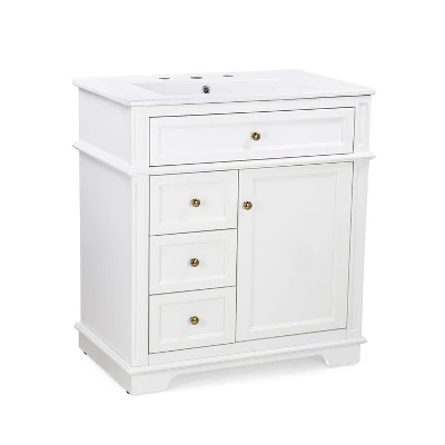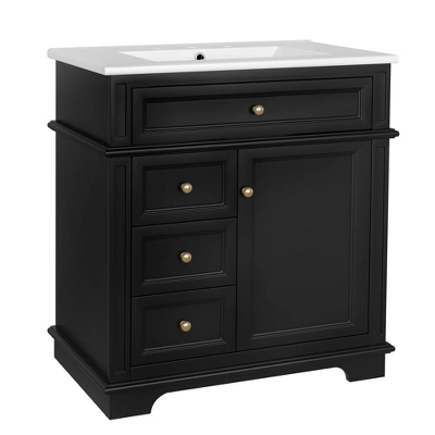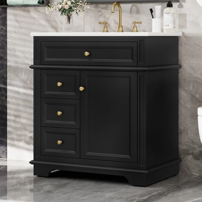 - Thoughtful Storage Configuration——Cabinet with Door Shelf: Hidden storage behind a soft-closing door, perfect for larger items like hair dryers or extra towels; Tip-Out Drawer: Convenient shallow drawer at the top for quick-access essentials like toothbrushes or cosmetics; Three Deep Drawers: Spacious lower drawers with metal slide rails for organizing toiletries, linens, or cleaning supplies; accented with elegant gold knobs for a touch of luxury.