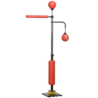 360° Reflex Bar: The reflex bag build in a 360° rotating reaction rod lets you dodge while you punch, increasing your skills with a design built specifically for the improvement of reaction, accuracy, and agility.Ultra-Sturdy: Our boxing bag with stand has 12 strong suction cups that ensure stability even throughout the hardest hits, and its shock-absorbing system decreases vibration at the base for extra secure placement.Adjustable Height: The punching bag with stand can be adjust from 4’7″ to 6’8″ to accommodate a wide size range, including kids, teenagers, adults, men, women, and professional athletes.Boxing Bag & Speed Bag: The standing punching bag with double design includes a boxing bag and speed bag for two ways to benefit velocity and muscle elasticity. Improve your performance, and get a cardio and upper body strength workout.Boxing Equipment Info: Overall Dimensions: 33.1″ L x 14.2″ W x 55.1″ – 80.7″ H. Includes: Air Pump.