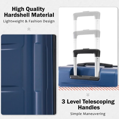 Expanable Spinner Wheels 2 Piece Luggage Set with Bags ABS Lightweight Suitcase with TSA LockWe have perfected our hard case luggage collections, with a 100% ABS material molded body coveted for its lightweight build that will take the heavy lifting out of your trip and make traveling a breeze. Featuring a horizontal stripe on the front facing portion, this design not only adds minimal style but also strength reinforcement for high level durability. Features a quality build consisting of a complex three-layer 100% ABS material composite compression, formulated to create a strengthened, durable and lightweight material that is easy to take with you on your adventures wherever you go and is built to last.Instructions for restting the combination lock: 1. The lock is preset at 0-0-0; 2. Use a pen or something pointed to press the rest button ( the small hole on the side of the lock ); 3. Enter your new combination by rotating the wheels; 4. Remove the pen and push once on the opening button. You new combination is now set.