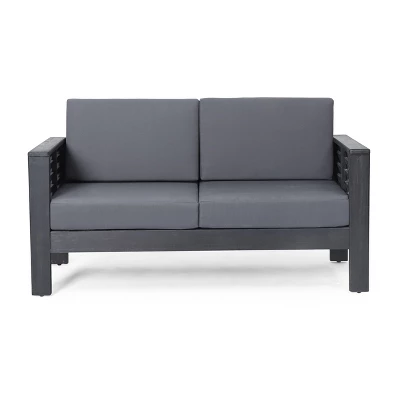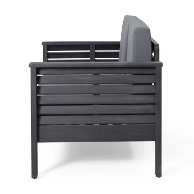 Enjoy your outdoor living space with this stylish and comfortable conversation set. Our loveseat and coffee table are the perfect addition to any backyard or patio, combining rich acacia wood and beautiful slat paneling to create a breezy oasis. With sleek shutter-styled accents and cozy cushions, this set offers a durable, streamlined look that will easily blend into your outdoor decor.Dearing Acacia Wood Outdoor Loveseat and Coffee Table Set with Cushions, Dark Gray:Includes: One (1) Loveseat, One (1) Coffee TableMaterial: Acacia WoodCushion Material: Water Resistant FabricMultiple Color OptionsAssembly Required