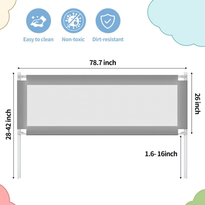 78.7-INCH BED RAIL FOR TODDLERS – Our guardrail is designed with a slightly shorter length than the corresponding queen and king beds to ensure that our bed rail can fit your bed perfectly. The insert bracket has an additional adjustable height from 1.6 to 16 inches to fit mattresses of different thicknesses