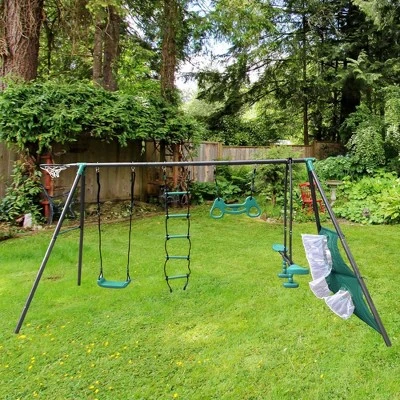 Introducing the Four Swingset: a delightful playground addition designed to bring endless joy to children aged three and above. This swingset, adorned in a captivating combination of deep green and black, is not just your ordinary swing – it’s a world of imagination and adventure nestled right in your backyard. Standing at a height of 70.97 inches, with a width of 53.55 inches and a length of 150.79 inches, this swingset provides ample space for kids to swing, climb, and play to their heart’s content. Its detachable design ensures effortless assembly and disassembly, making it convenient for storage or relocation as needed. The Four Swingset comes complete with an array of thrilling features. The included climbing ladder adds an exciting element of exploration, encouraging young adventurers to reach new heights. The swing seat offers comfortable seating, while the suspended rings provide an opportunity for little ones to test their strength and coordination.But that’s not all – we’ve also added a face-to-face swing for interactive play, a basketball hoop to practice those winning shots, and even a soccer net for aspiring athletes. With this swingset, your children will have countless opportunities to stay active, develop their motor skills, and bond with friends and siblings. Now, let’s talk about the color. The enchanting shade of deep green chosen for this swingset brings with it a multitude of benefits. Green is often associated with nature and tranquility, creating a soothing and harmonious atmosphere in your backyard. It blends seamlessly with the surrounding foliage, complementing any outdoor setting. The black accents add a touch of modernity and elegance, enhancing the overall aesthetic appeal. At xiunan-leisure , we believe in creating products that go beyond functionality. We strive to infuse each design with warmth, charm, and a sense of wonder. The Four Swingset is no exception – it’s a testament to our commitment to providing children with a safe and exhilarating play experience. Invest in the Four Swingset today and watch as your little ones create lasting memories filled with laughter and joy. Say goodbye to boring afternoons and hello to endless fun right in your own backyard. Order now and let the adventure begin!