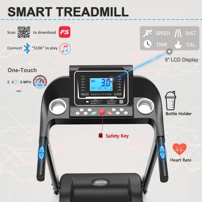 - ✅ 5″ Large Display: 12 workout programs of the treadmill is pre-set to help you adjust your workouts in different levels, it comes with a 5″ smart LCD display that tracks your Time, Calories, Distance, Speed, Heart Rate etc.