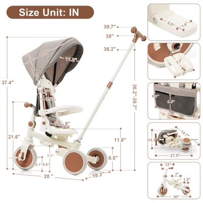- 7-in-1 Multifunctional-This baby tricycle can be used as a learn-to-ride trike with a canopy, a push tricycle, a standard tricycle, and a balance bike, which meets the needs of children at different stages of growth from 1 to 6 years old.
