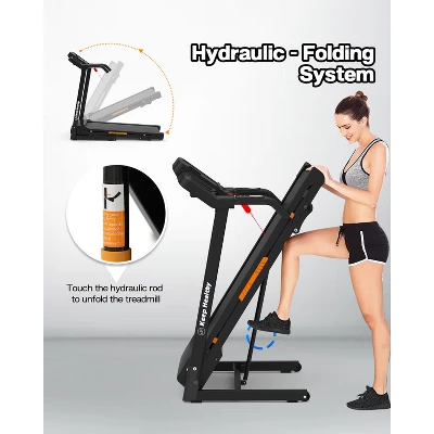 - SPACE SAVING & HOLDER – The hydraulic lever allows fold the folding treadmill in a breeze (folding size: 27.3 * 28.8 * 46.2inches). which is convenient to store and space-saving. The space saver treadmill equipped with transport wheels, so you can move it to any place you want to exercise easily. The treadmill for apartment is also equipped with 2 cup holders and 1 pad holder to help you stay hydrated during / enrich your exercise time.