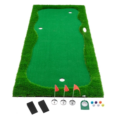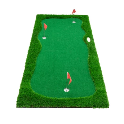 - The golf putting green comes with 3 golf holes and is also equipped with a stainless steel cup and flagpole to improve accuracy and precision when hitting, giving you a realistic golf experience.