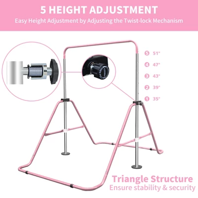 - 【5 HEIGHT ADJUSTABLE BARS】 This gymnastics bar has 5 adjustable heights: 35”-39”-43”-47”-51”, easy to maneuver for kids of all ages. Our durable gymnastics equipment will last for years, allowing the bar to grow with your child.