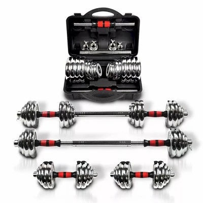 - Our all-in-one dumbbell-barbell set allows you to have a versatile workout. The dumbbells can be used to sculpt your arms, while the barbell setup allows you to practice dead-lifts or squats. This product is perfect for improving overall health or encouraging weight loss. It also helps strengthen the upper body, core muscles, and lower body. The adjustable design makes it easy to stay fit at home