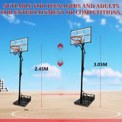 - Overall Dimensions: Backboard size 44 x 28″ ( L x W ),Adjustable Height 8.04 ft -10.01 ft, Base size 43.31” x 28.35” x 9.84″ ( L x W x H ),Rim diameter: 17.72″(Double iron rings). Assemble needed