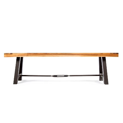 - Offer your outdoor seating ensemble an addition that you will not regret. Our sophisticated slat-panel bench brings a perfect amount of stylish comfort and modern industrial aesthetics to your backyard or patio. Featuring a durable powder-coated metal frame and a finished rich acacia wood top, our bench is an excellent addition to your outdoor decor.