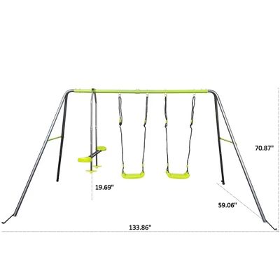 We’re excited to introduce our newest product, a metal swing set designed for four children to play together. This swing set is perfect for families with multiple children or for those who love to entertain guests.The swing set measures 133.86 inches in length, 59.06 inches in width, and 70.87 inches in height. It weighs 47.4 pounds and features a face-to-face swing and two swing seats. The sleek black and lemon green color scheme adds a modern touch to any backyard or play area.Our swing set is easy to assemble and comes with detailed instructions for your convenience. Spend quality time with your loved ones while watching them play on this fun and safe swing set. Whether you’re hosting a backyard barbecue or just enjoying a quiet afternoon with family, our swing set is sure to bring joy and laughter to all.Thank you for considering our product. We hope that it will provide your family with endless fun and memories for years to come.