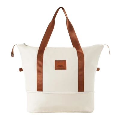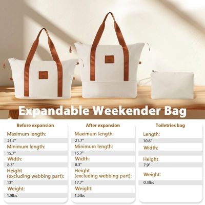 - Expandable duffel bag dimensions (front shape is trapezoidal): longest length: 21.7″, shortest length: 15.7″, width: 8.3″, height: 13″, expanded height: 17.7″. The duffel bag comes with a trolley sleeve with zippered pocket, and you can conveniently attach it to the adjustable handle.