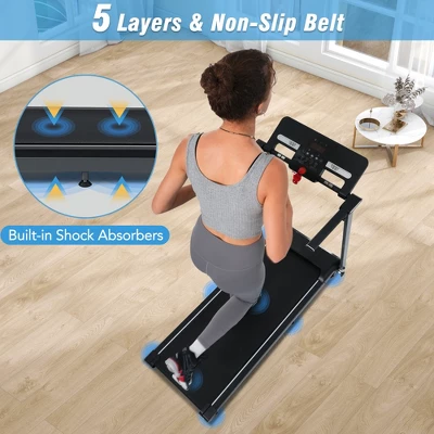 New Treadmill for Home – The lightweight, foldable design of this folding treadmill makes it easy to fold, move and store, perfect for walking, jogging and running at home/office/apartment, making it the perfect choice for home workouts.2.5HP Powerful Motor – Featuring a powerful 2.5HP ultra-quiet motor that ensures stable operation of the machine and also provides a quiet movement environment. Adjustable speed of 0.5-7.5 mph, supports up to 265 lbs. capacity and operates at no more than 55 decibels.Larger Running Area – The 15.55″ x 39.76″ running belt provides plenty of space for exercise and a safer, more comfortable experience for your run. It’s not just a regular treadmill either, it’s also suitable for your family and pets.Fitness Tracking Display — Our portable Treadmill is designed with a LED display to show speed, distance, time, and calories burned, allowing you to visualize your exercise and maintain motivation. You can control the speed or stop the treadmill by pressing the remote control.Protect Your Knees — 5 layer anti-slip belt of this desk treadmill is designed to absorb the force of your step, to protect your joints and ligaments from damage.Manual Incline Without Tools: Effortlessly activate adjust incline in just 2 seconds. Compared to regular walking pad, its 3% incline design enhances fat-burning efficiency by up to 30%! Tested for short workouts during work or home breaks, it provides a simulated hill-like exercise experience, effectively shapes the glutes and legs.