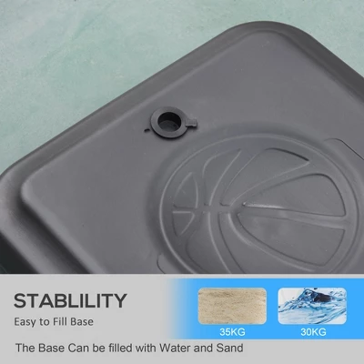 - Portable Weighted Base: The weighted base rolls easily from location to location and can be filled with 77 lbs of sand or 66 lbs of water to help keep it in place. Backboard height: 52.25″-63.5″H. Note: Suitable for swimming pool side under 39.25″.