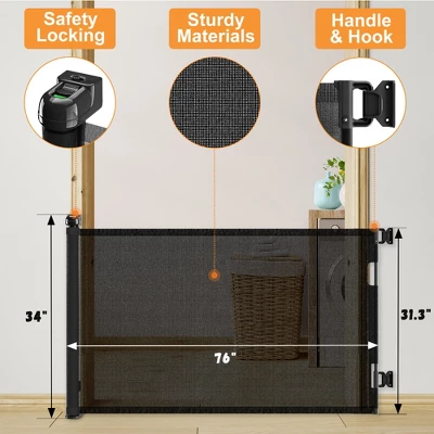 - Retractable Baby Gate : This Extra Wide Retractable Gate extends up to 76″ wide and is 33″ tall.