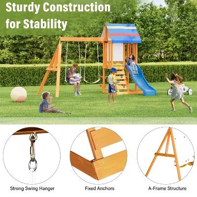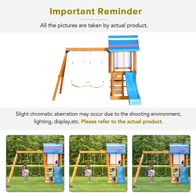 This outdoor children’s playset is crafted from durable cedarwood, offering long-lasting performance and natural resistance to the elements. Featuring a sturdy A-frame structure for added stability, it ensures safety and security during play. The set includes a slide, two swings with adjustable heights, and a rock-climbing wall, providing versatile play options that encourage physical activity and imaginative fun for kids of all ages. Designed for comfort, the slide has smooth edges and a gentle slope, while the swings offer adjustable ropes for a stable experience. Perfect for any garden, backyard, or playground, this weather-resistant playset is built to withstand outdoor conditions, providing endless entertainment for children.Equipped with a rock-climbing wall, this playset offers children the opportunity to build strength, coordination, and balance as they ascend to the top.The slide is designed with smooth, rounded edges and a gentle, consistent slope, ensuring a comfortable and safe ride.The left-side A-frame structure offers enhanced stability and support to the entire playset. This thoughtfully engineered design ensures the playset remains firm and secure, providing a steady foundation for active play.The wooden ladder not only provides a sturdy and reliable way for kids to climb up, but also can be served as a bench and for kids to have a break, a picnic table for kids to have lunch .
